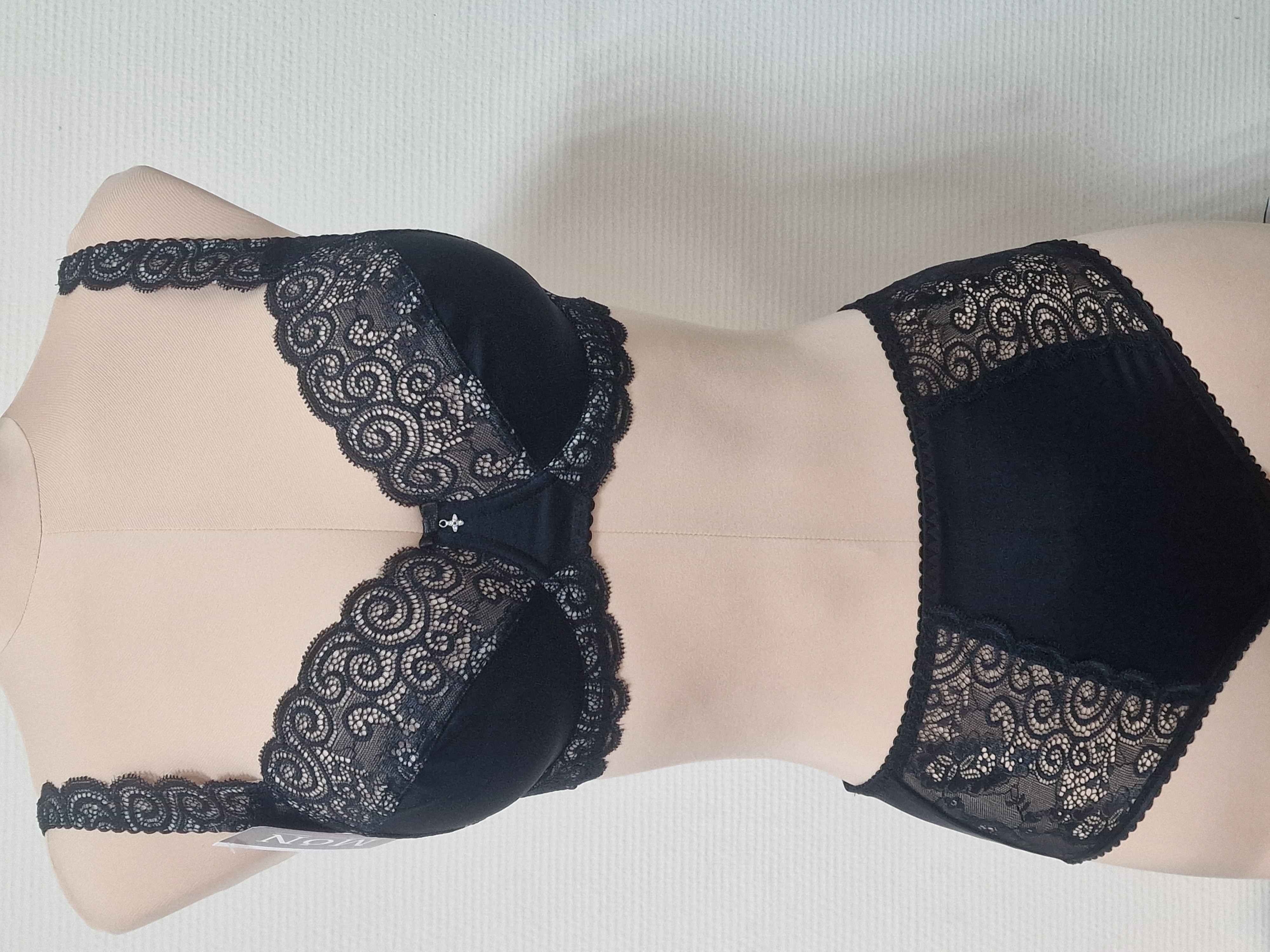 Мягкая чашка из эластичного кружева и эластичной микрофибры. Чашка внутри дублирована хлопком. В модели предусмотрены подгрудные косточки. Верх чашки и пояс бюстгальтера выполнены с дополнительным нижним слоем из эластичной сетки с целью улучшения формоустойчивости, что актуально для больших размеров.