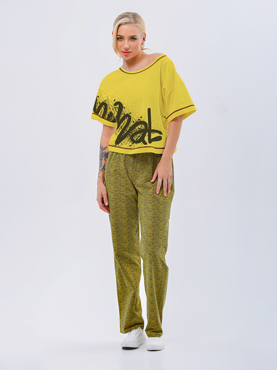 Этот домашний костюм сочетает в себе стиль и комфорт. Комплект состоит из стильной свободной укороченной футболки, которая выделяется контрастной отстрочкой по горловине, низу рукавов и изделия. Яркий, стойкий принт, расположенный на полочке и рукаве, добавляет модели современный и динамичный вид. Брюки прямого кроя выполнены из набивного полотна с геометричным рисунком, что подчеркивает актуальность и модные тенденции. Мягкая тесьма на талии обеспечивает надежную фиксацию и комфорт при ношении.