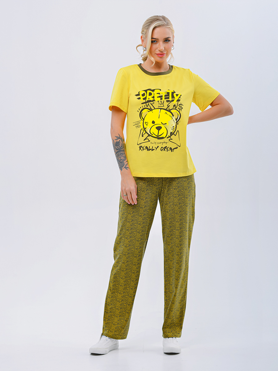 Яркий молодежный домашний костюм, созданный для комфорта и стиля в повседневной жизни. Изготовлен из высококачественной ткани хлопок с добавлением эластана, это обеспечивает отличную посадку и свободу движений. Футболка имеет удобную горловину, выполненную из рибаны, и украшена ярким стойким принтом на полочке, который радует глаз и подчеркивает индивидуальность. Брюки прямого кроя изготовлены из набивного трикотажного полотна с мягкой тесьмой на талии, что обеспечивает дополнительный комфорт при носке.