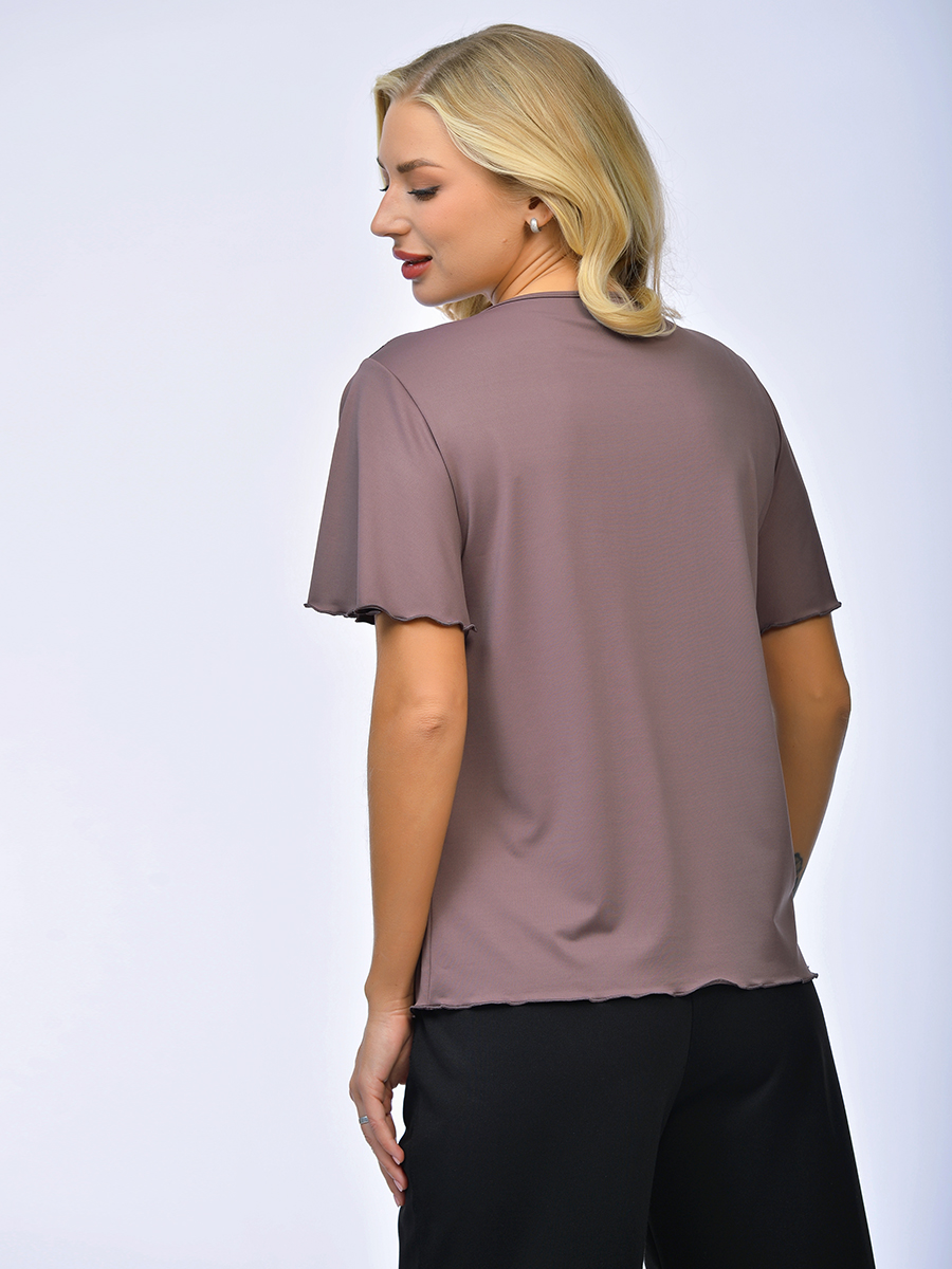 Элегантная женская блузка из плотного струящегося полиамидного трикотажа с кружевом «ресничка» добавляет нежности и изящности образу. По низу рукавов и по нижнему краю изделия выполнена закрутка. Кружевная кокетка на груди. Спинка цельная, горловина отделана тонким кантом, который подчеркивает чистоту линии декора. Рукав расклешенный, колокольчик.