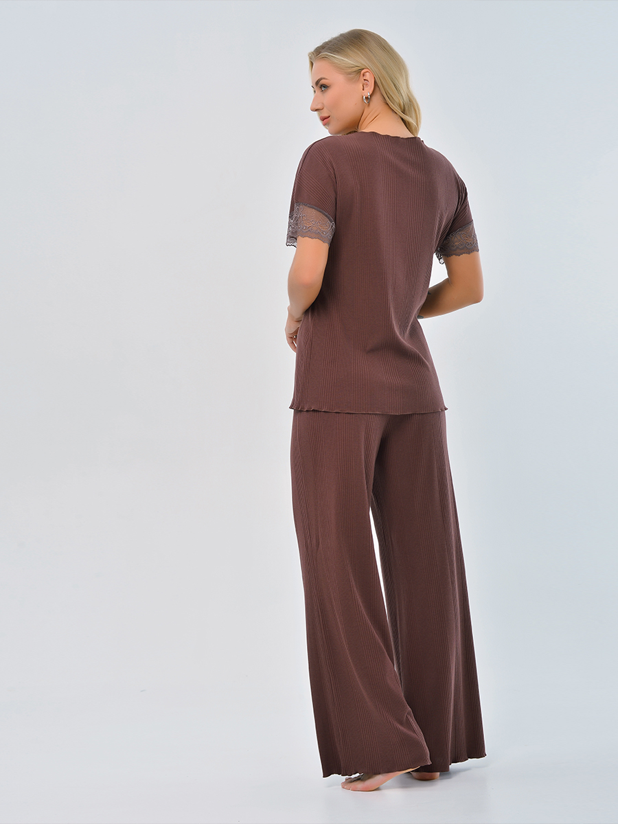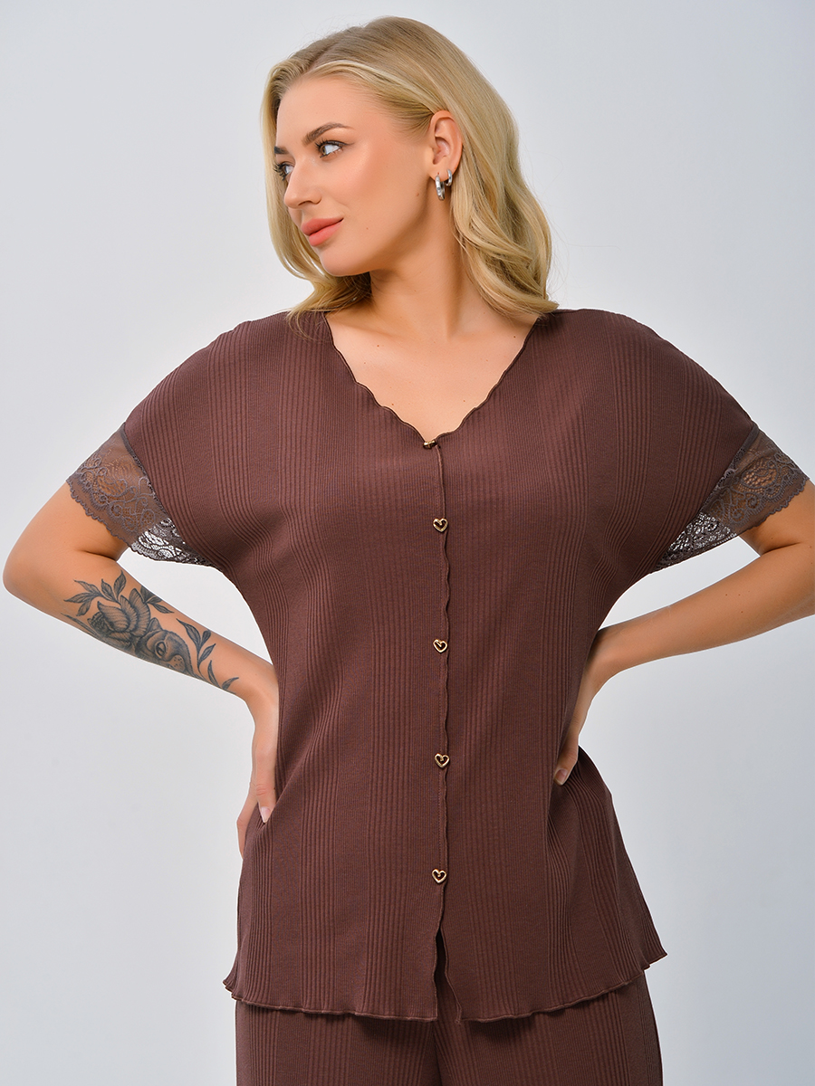 Изысканный домашний комплект с фактурой рубчик состоит из блузы с кружевной отделкой и брюк палаццо. Свободный крой, расширенный размерный ряд, классическая длина подчеркнет фигуру и сделает этот домашний комплект любимым и универсальным. Легкие широкие брюки с мягкой эластичной тесьмой на талии. Свободная блузка с имитацией застежки по центру украшена декоративными элементами в виде сердечек, спущенный рукав с ажурным кружевом добавляет легкости модели.