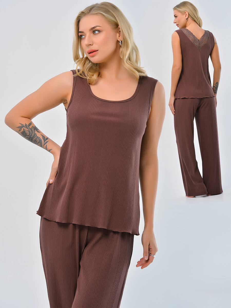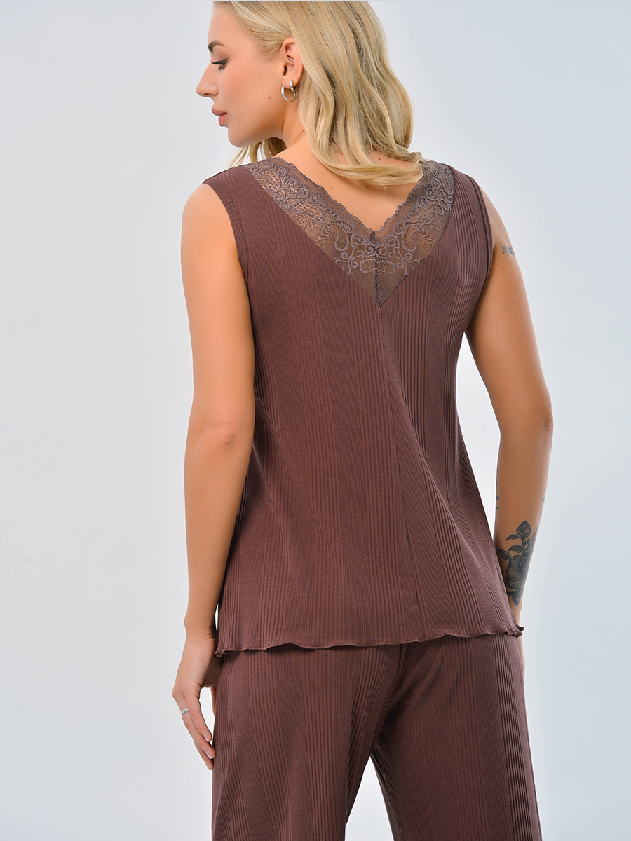 Изящная модель базовой майки с кружевным V образным вырезом на спинке. Плавные линии модели, кружевной акцент на спинке делают повседневный стиль оригинальным и женственным.